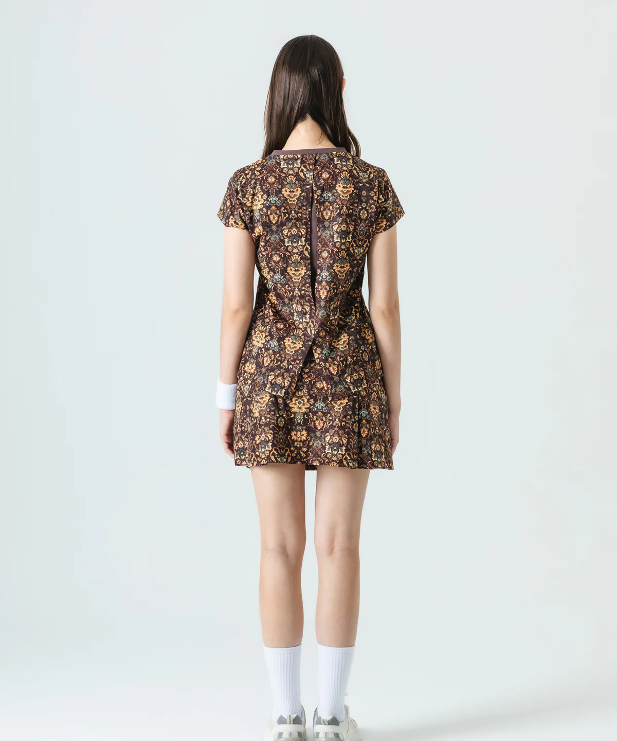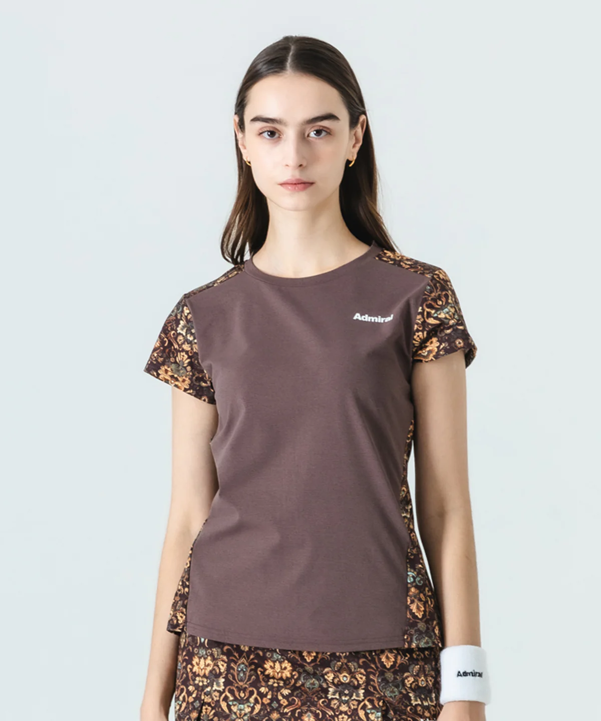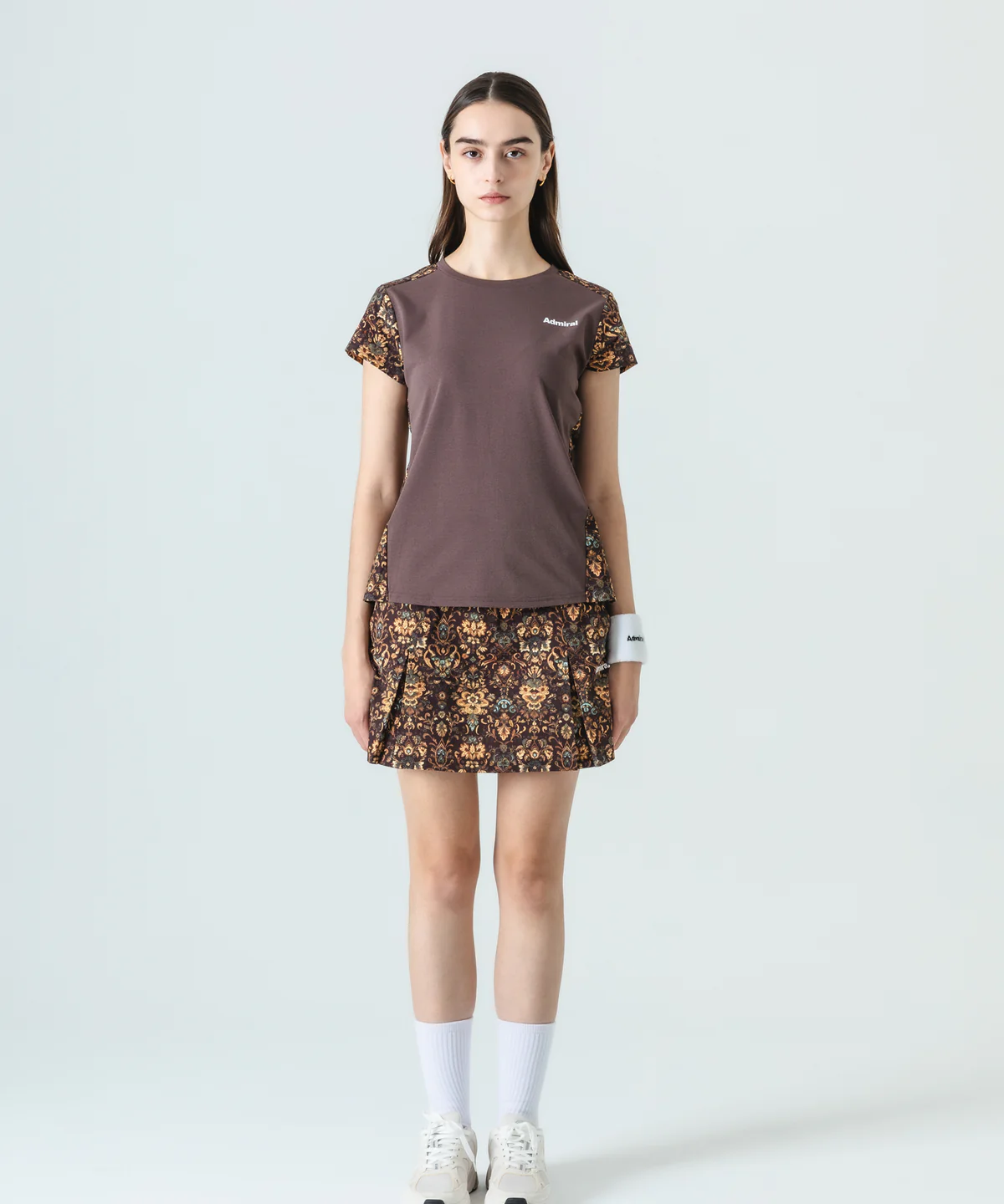 背面2重レイヤードの変形デザインTシャツ。 背面にダマスク柄を用い、 生地が左右でクロスしスリット状に重なった遊び心のあるレイヤード仕様。 ポリエステルでありながら綿のようなやわらかい風合いと素朴なハリ感のある素材を採用。