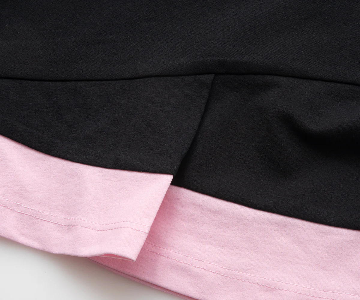 ・アシンメトリーな裾切替にバイカラー配色を施したTシャツ。